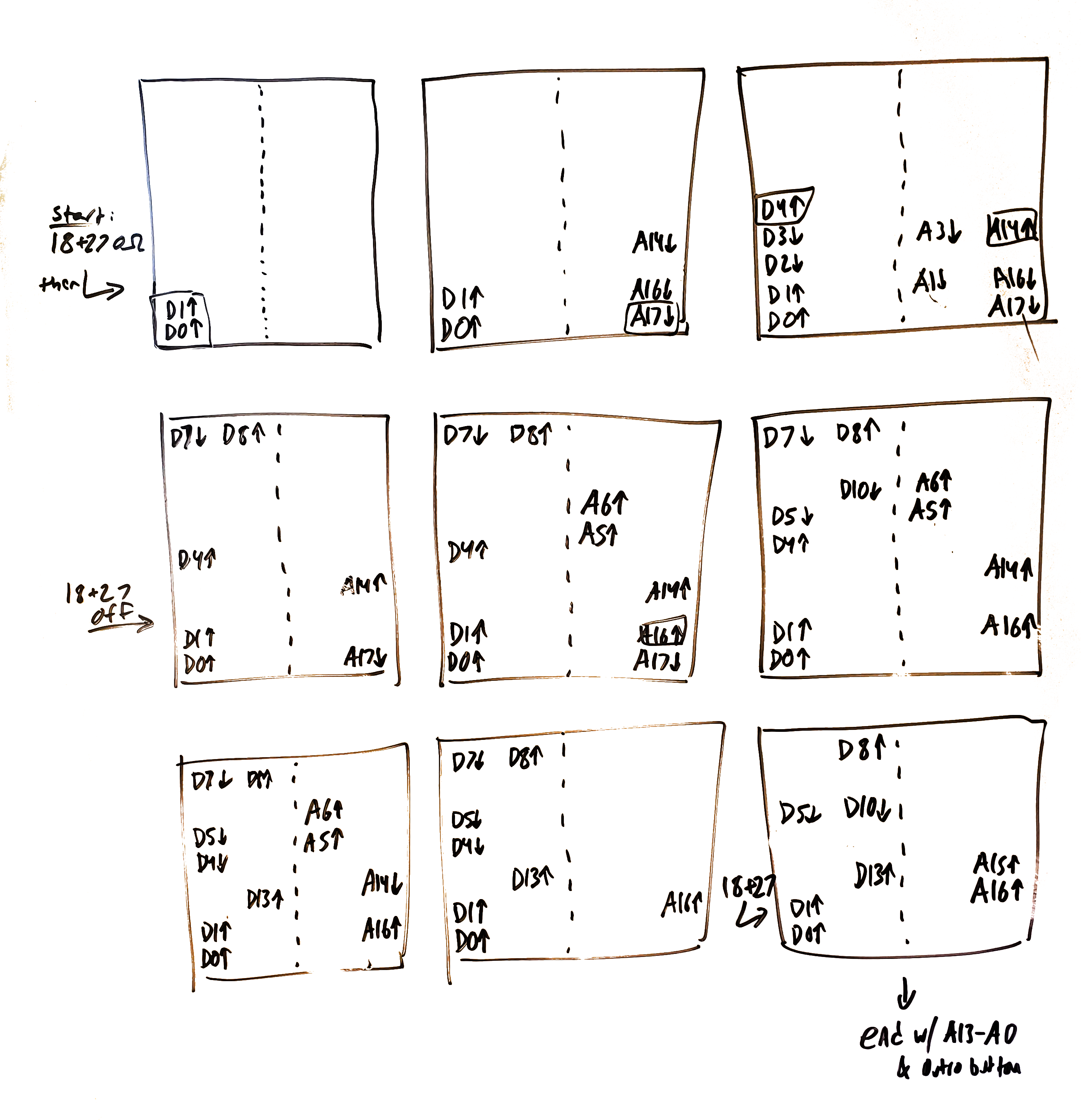 Drum Machine with preset beat /Rock1. Each box (above) is a cool-sounding state on the logic controller. An arrow up means switch up (connection of that ROM line to V+: logic 1), an arrow down means switch down (connection to Gnd: logic 0). The goal was to go from box to box, and I gave myself a lot of room in between to play around.