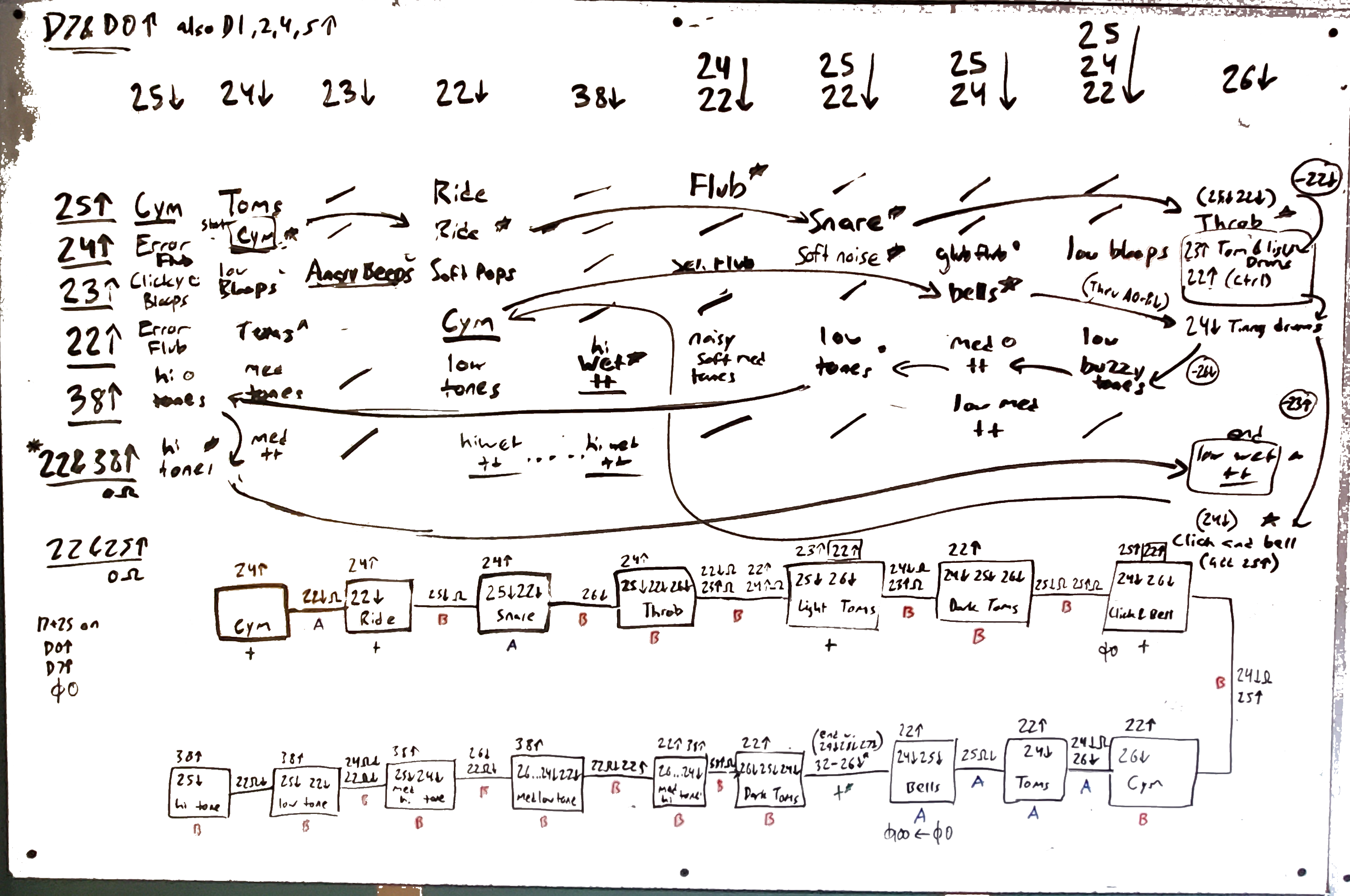 A connection between D6+A13 on the ROM produces a warped suspended cymbal sample. The sample is hammered ten times to create a quickly staggered wave of warped cymbals. D0, D1+V and D5+G 'capture' each sample, looping them and reversing them at various speeds depending on where in the waveform each sample was. Since they were all slightly off, the samples are gradually scattered. Next, A12-17 + V 'freeze' the samples in place, causing them to loop on one subsection of the waveform. Combinations of connections between A12-17 + G change the timbre- from cymbal to drums to bells and more.