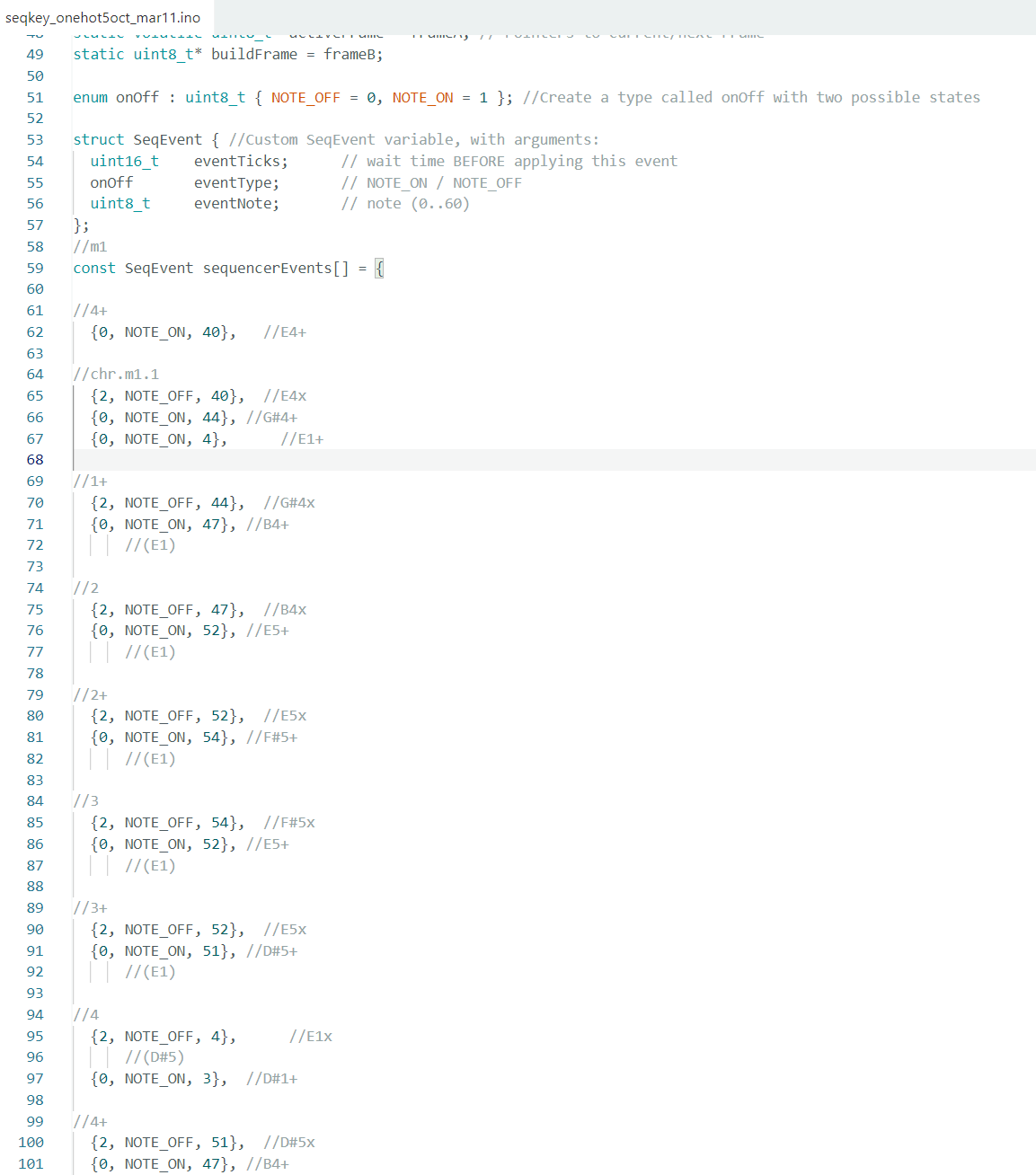 Created with a homemade digital sequencer for the Casio MT240. Part of the sequencer event list is displayed below. There are about 82 notes, played at a speed of ~10mS per note. The whole loop at max speed then cycles at 82 notes every ~.82 seconds.